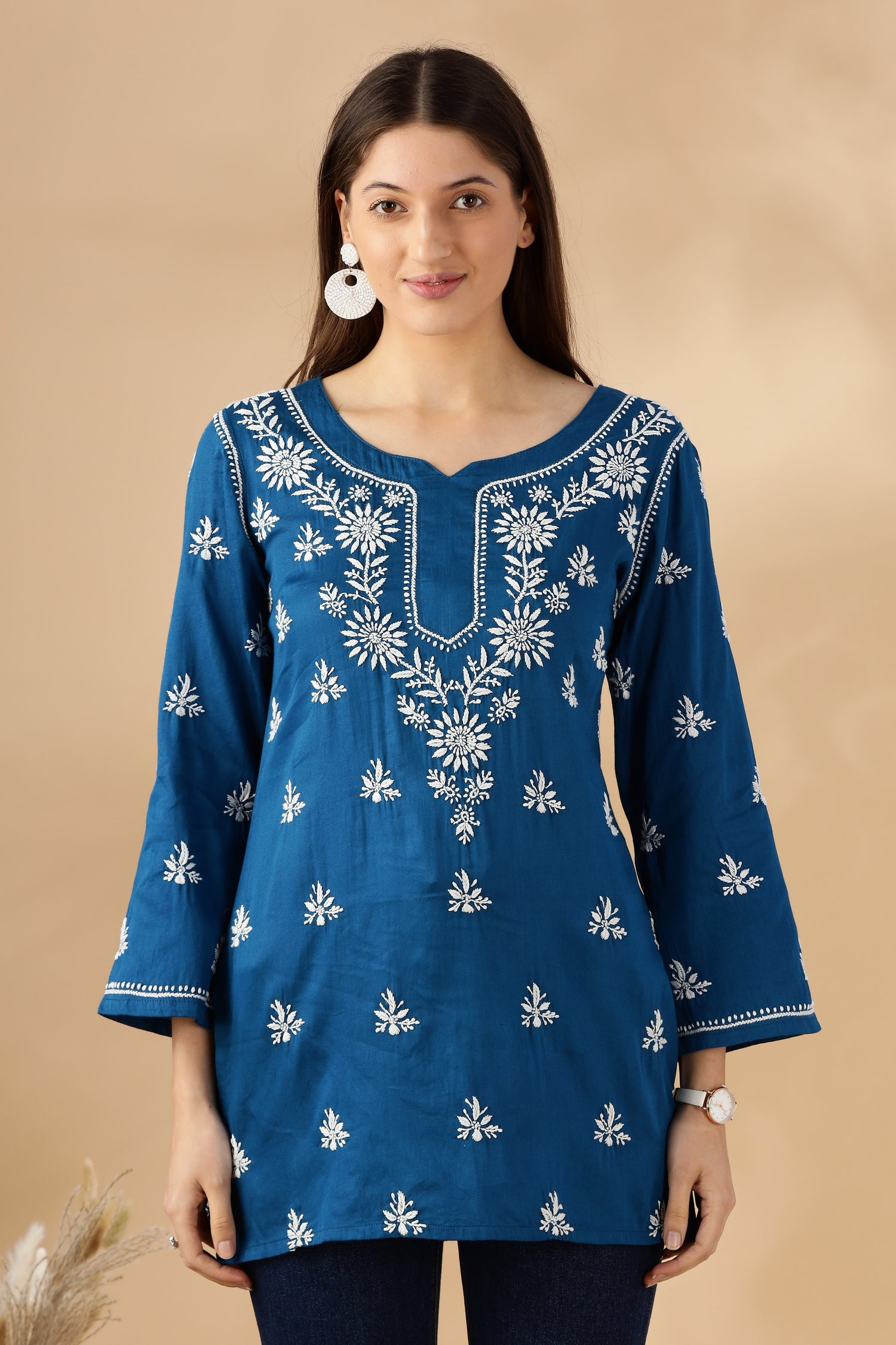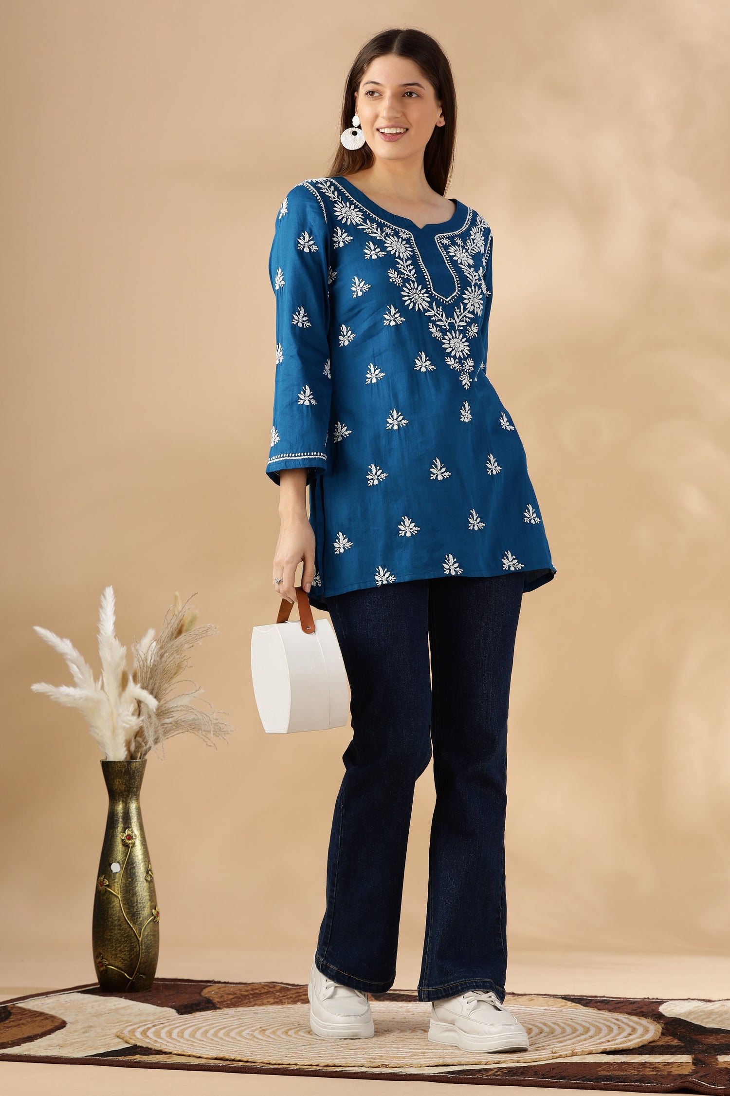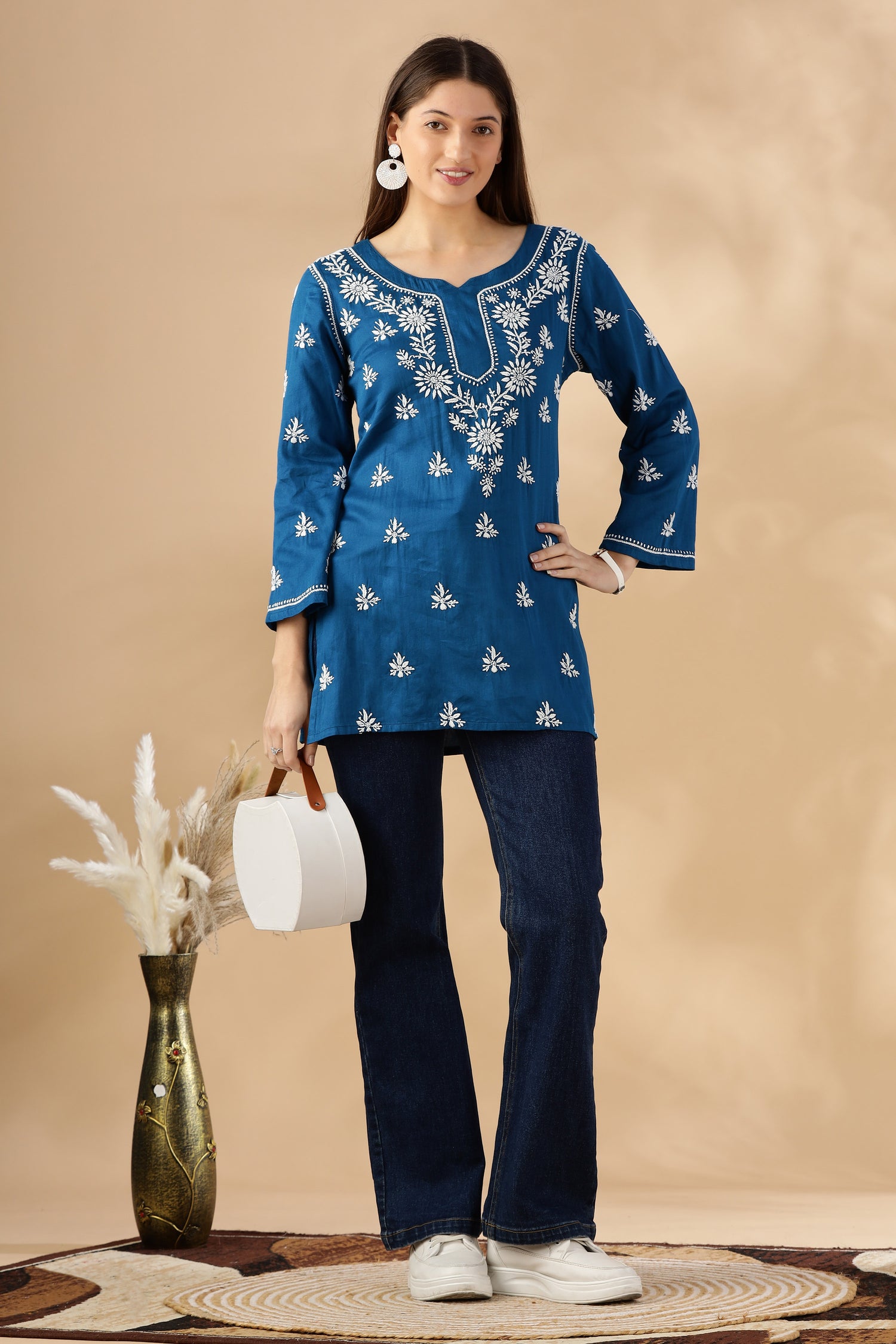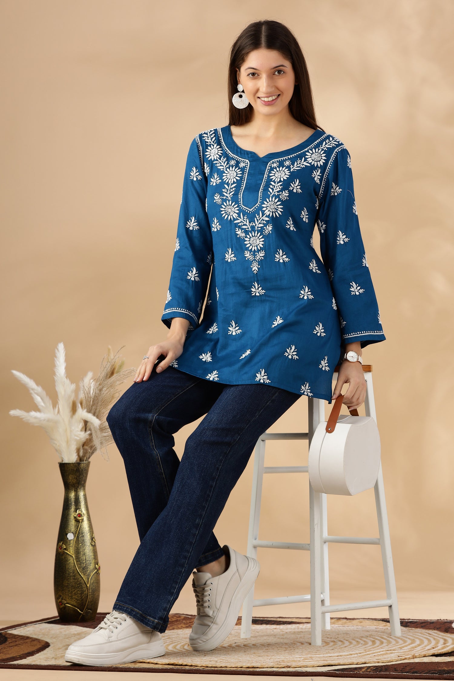 This blue short top, crafted in airy Chanderi cotton, features delicate hand-embroidered Chikankari that brings a touch of elegance to everyday wear. With its subtle sheen and timeless silhouette, it’s a versatile addition to your ethnic wardrobe—perfect for effortless, graceful styling.