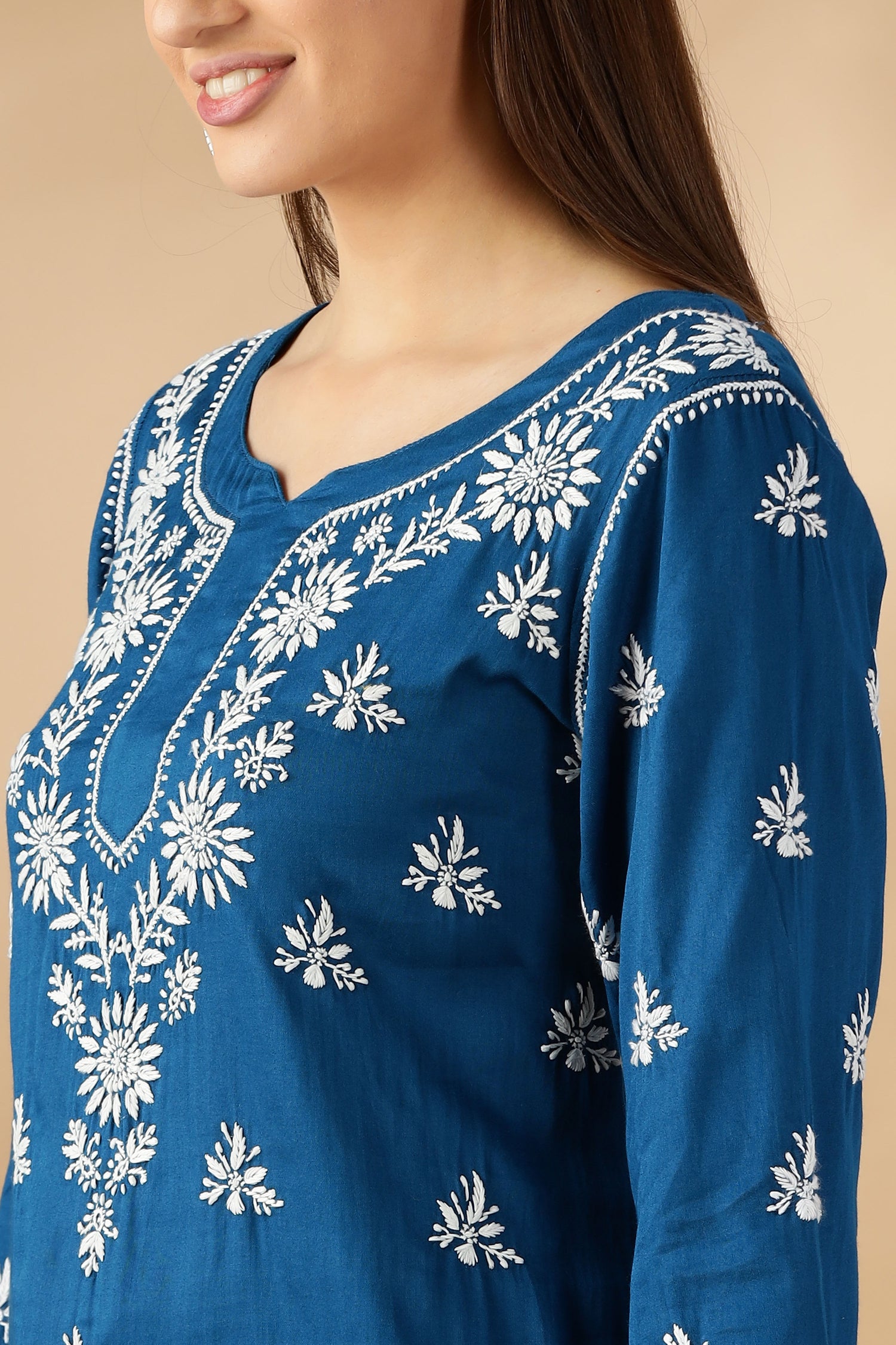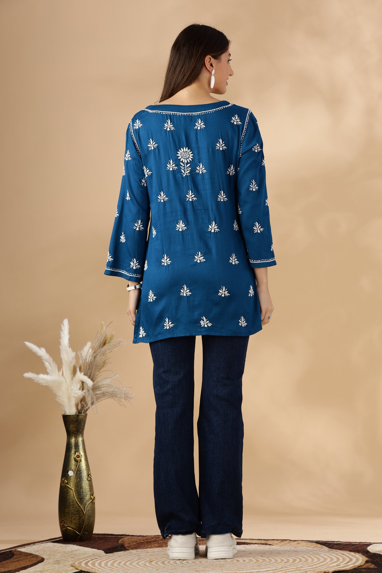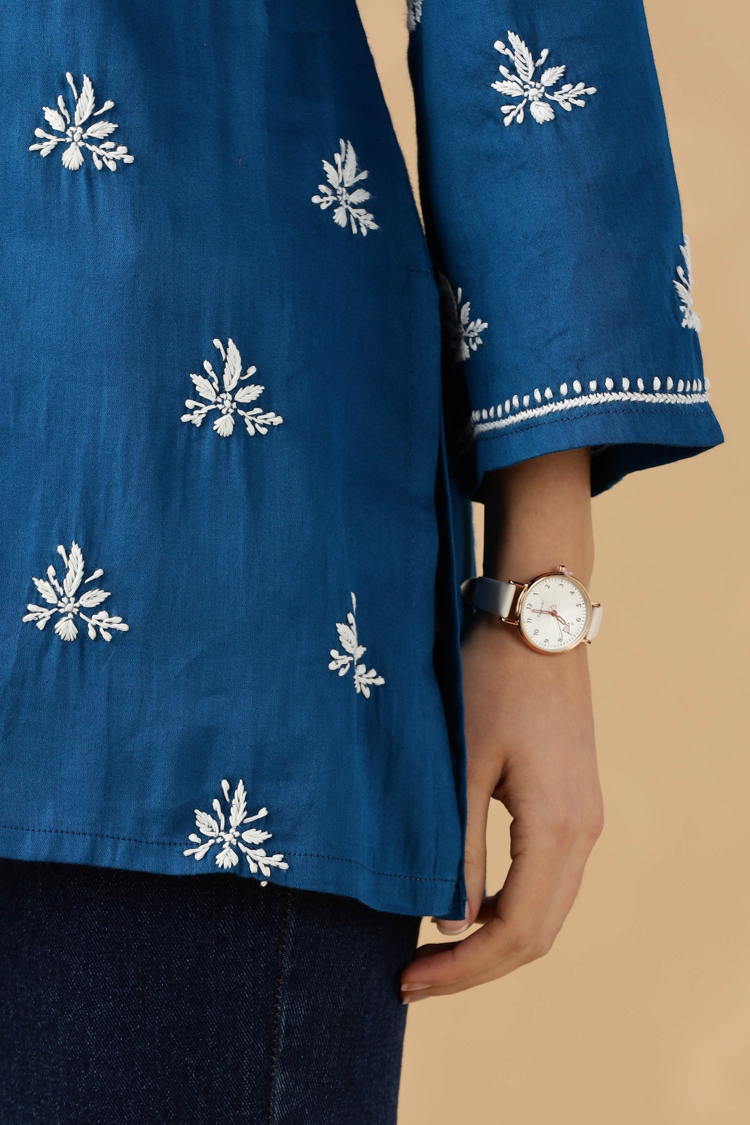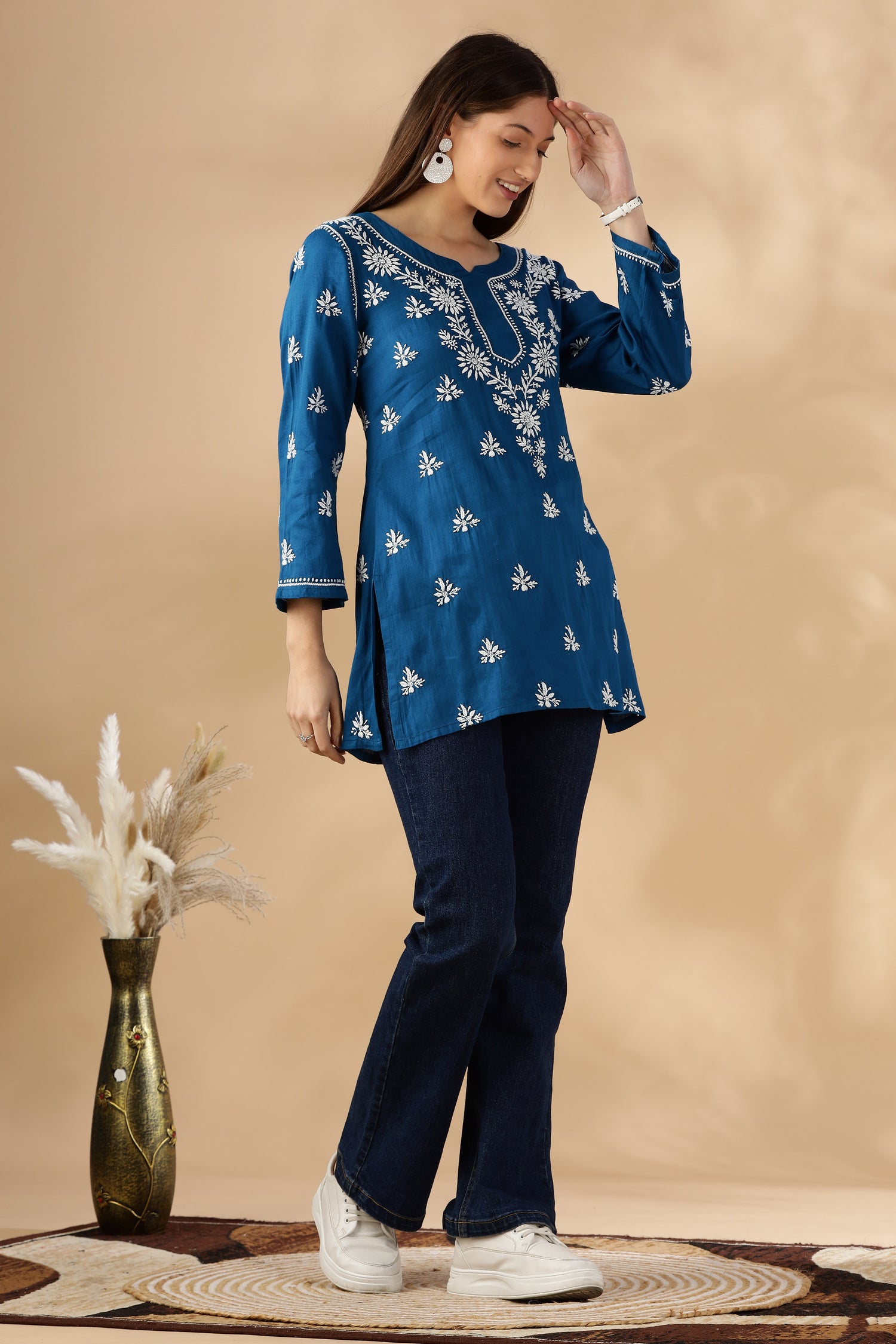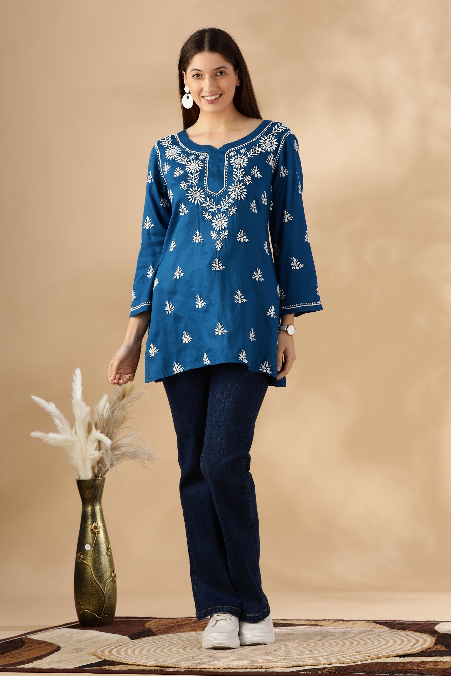 This blue short top, crafted in airy Chanderi cotton, features delicate hand-embroidered Chikankari that brings a touch of elegance to everyday wear. With its subtle sheen and timeless silhouette, it’s a versatile addition to your ethnic wardrobe—perfect for effortless, graceful styling.